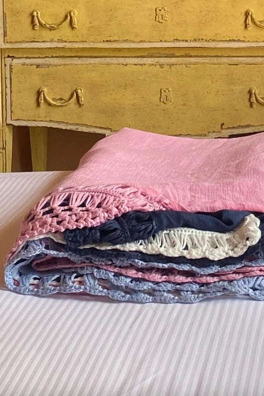 This beach worthy pale blue cover up has beautiful on-trend crochet detailing. Cut straight from bust to hem and perfect to throw over your favourite swimwear on the beach or from pool to bar. Cool to wear made in a soft viscose crepe with cotton crochet trim on all sides and stunning feature neckline.