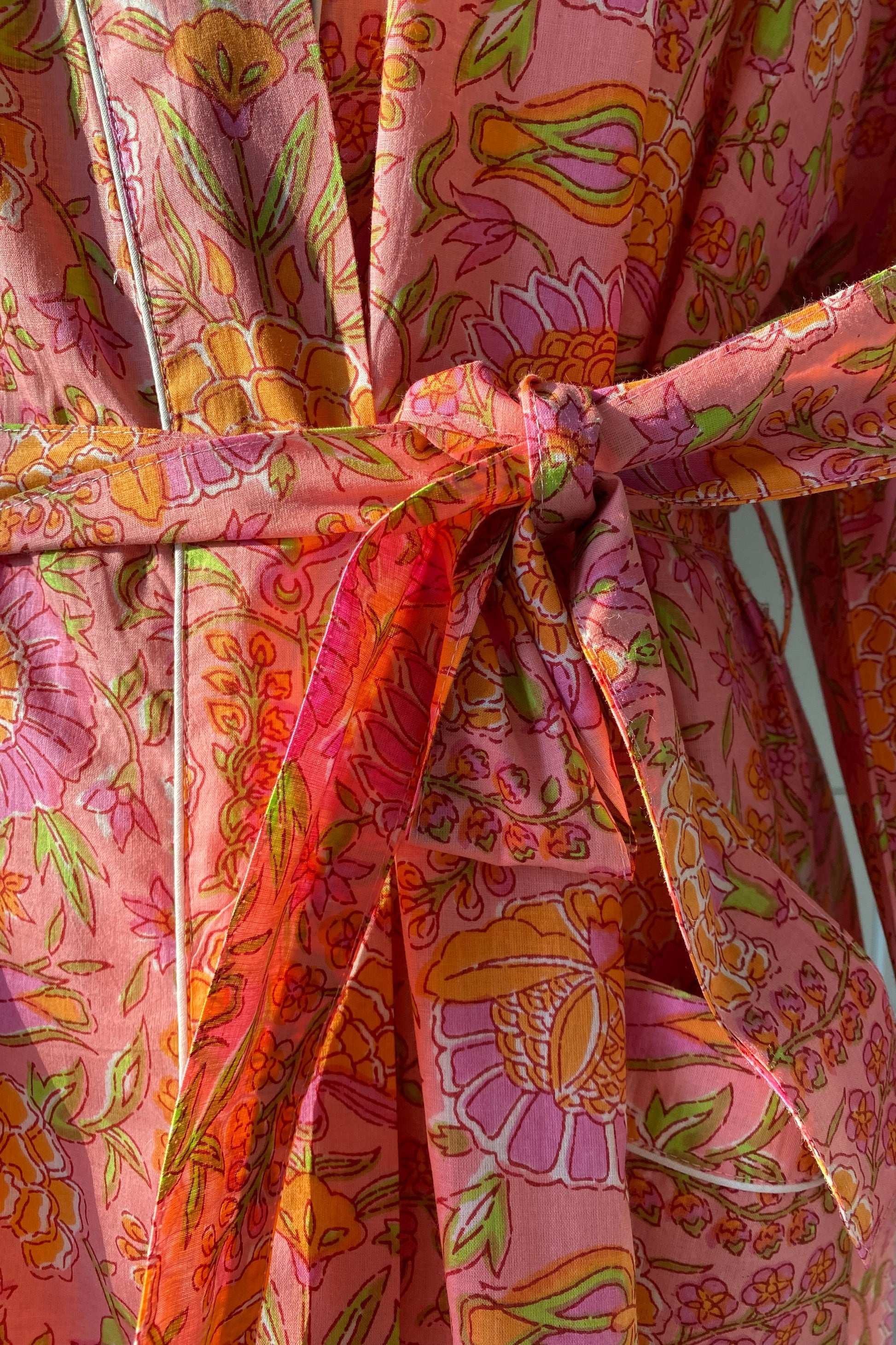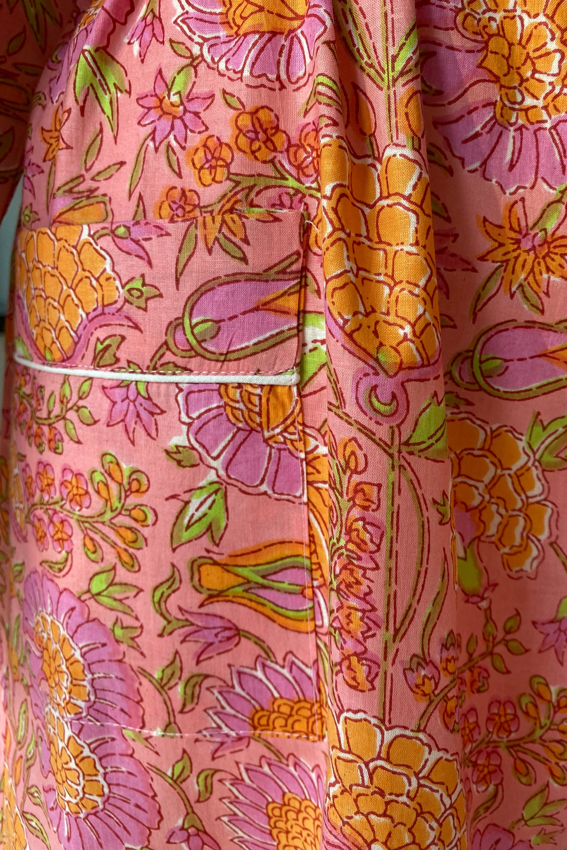 Handcrafted in Jaipur from lightweight organic cotton, the Colette floral block print robe features a pretty orange and pink design printed by skilled artisans. With long sleeves, patch pockets, white piping, and a self-tie belt, it’s effortless and comfortable to wear.