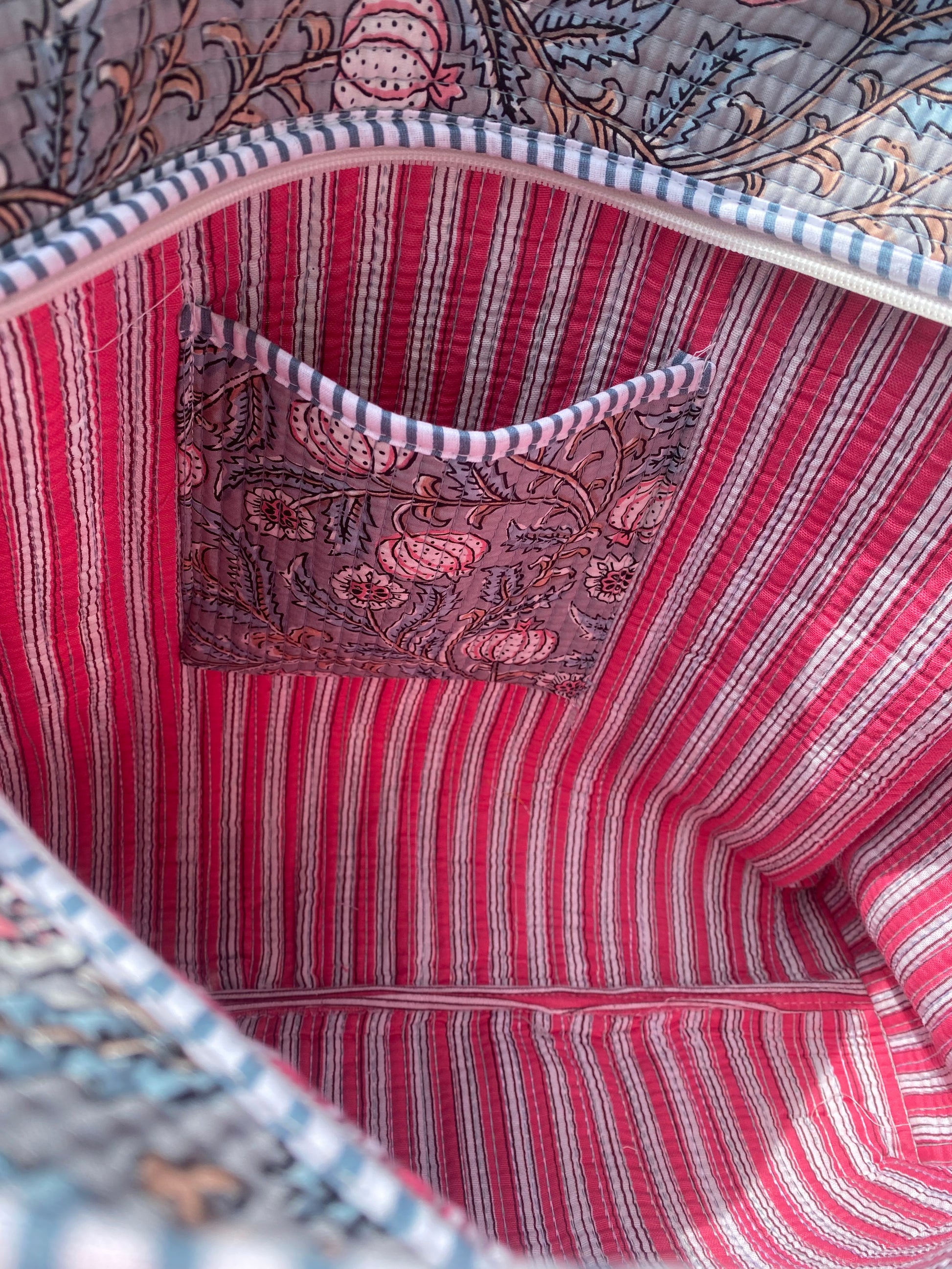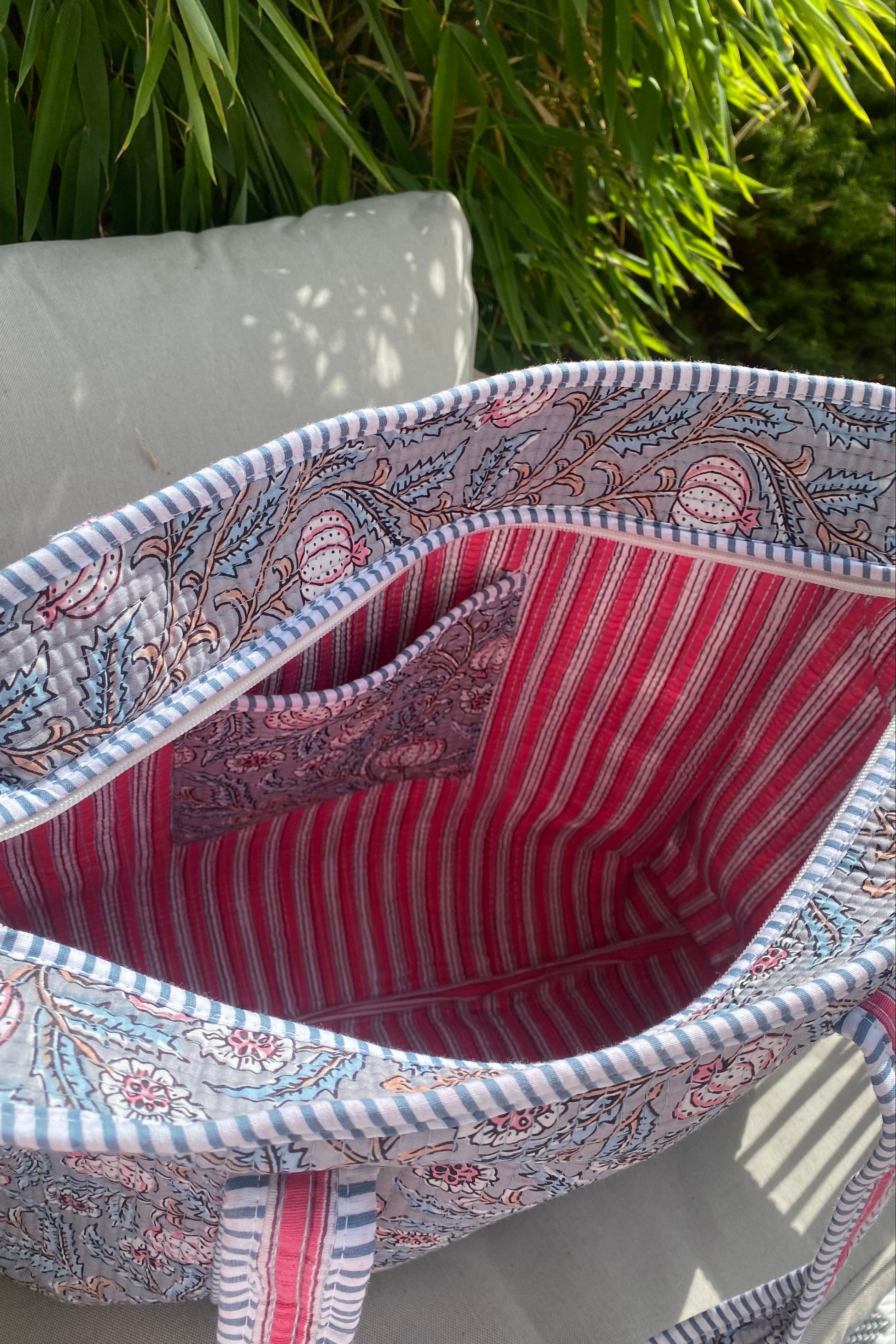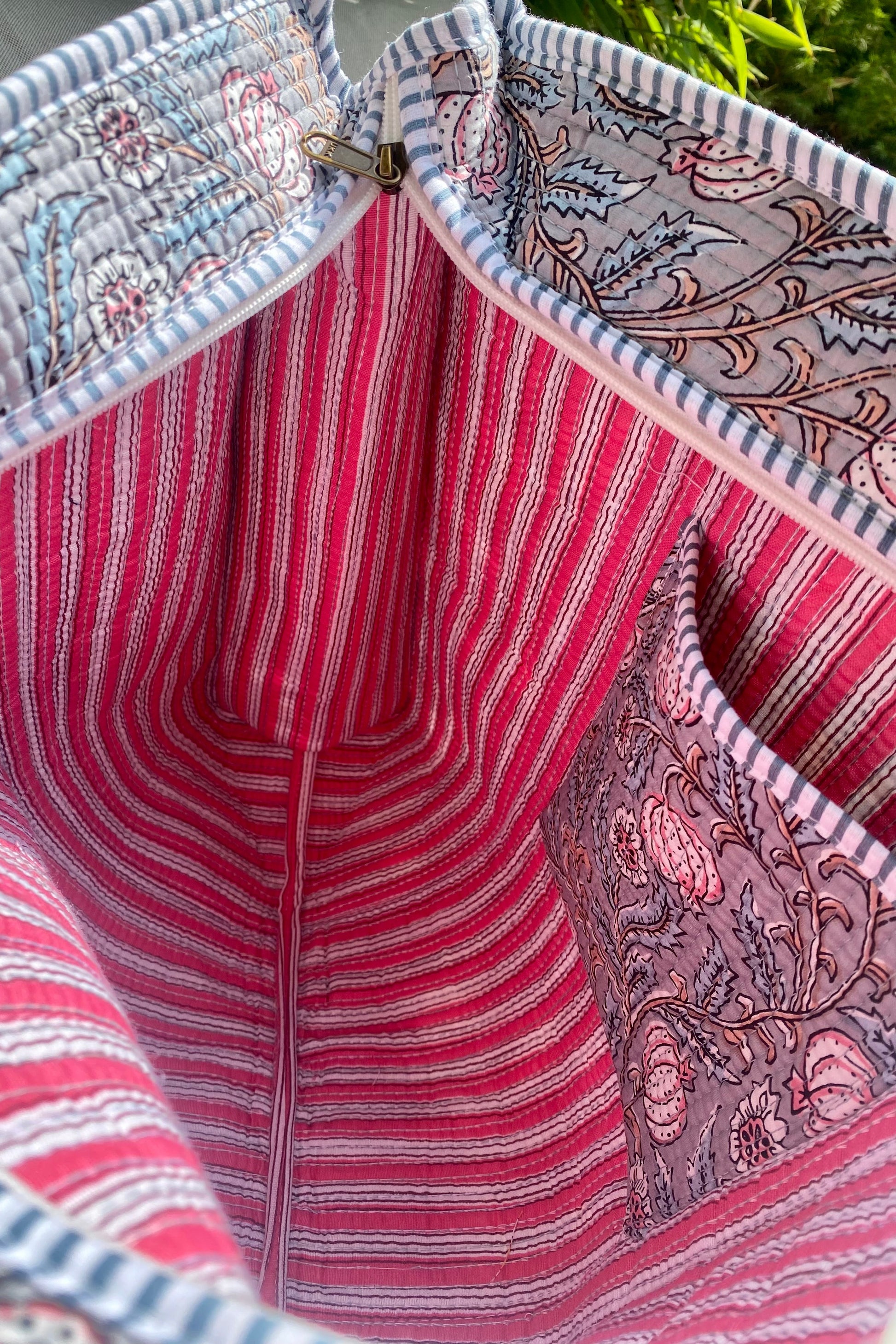 This quilted tote bag blends beauty, craftsmanship, and practicality. Hand-block printed in Jaipur on eco-friendly organic cotton, it features a soft pale blue and pink pastel floral design, finished with a pretty pink-and-white striped lining.