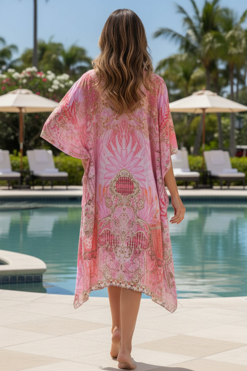 The Montego Bay kaftan is designed in one of our signature animal prints, a romantic colouration of pastel pinks and peaches with 'gold' detailing inspired by vintage scarf prints. The elegant knee length shape is cut in a flattering and loose style, with a plunging V tie neckline, crystal embellishment and side splits which allow ease of movement. Chill out in the heat in a breezy silhouette of pink and golden hues for that ultimate beach look.