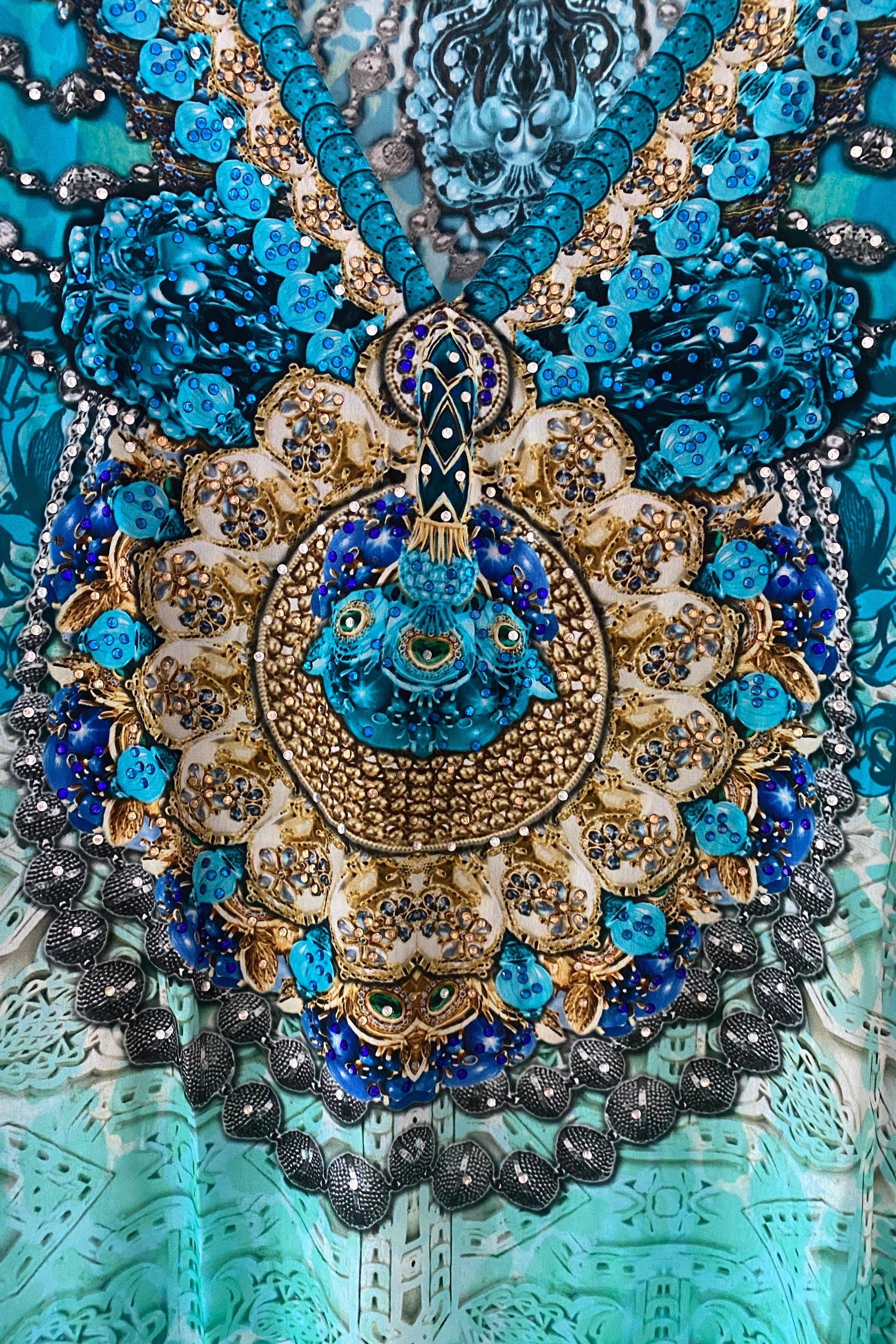 Breezy and beautiful in mint and aqua tones, this crystal embellished long length kaftan drapes effortlessly with wide sleeves and an airy fit. Perfect for sun drenched holidays taking you from day to night.