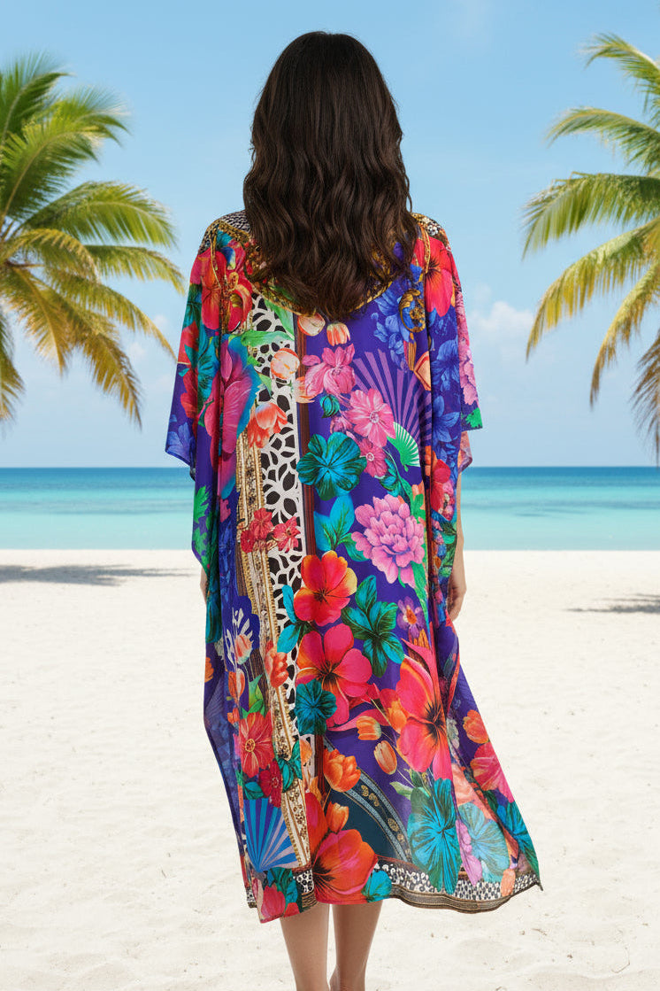 Bright bold and island-inspired, the Bali Orchid Kaftan features pink tropical florals on a violet base with crystal embellished detailing. Effortless glamour for sun-soaked getaways. Crafted from lightweight viscose, it drapes beautifully in a one-size fit with crystal embellishment at the neckline. With kimono sleeves and side splits, it flows effortlessly from poolside lounging to sunset dinners.